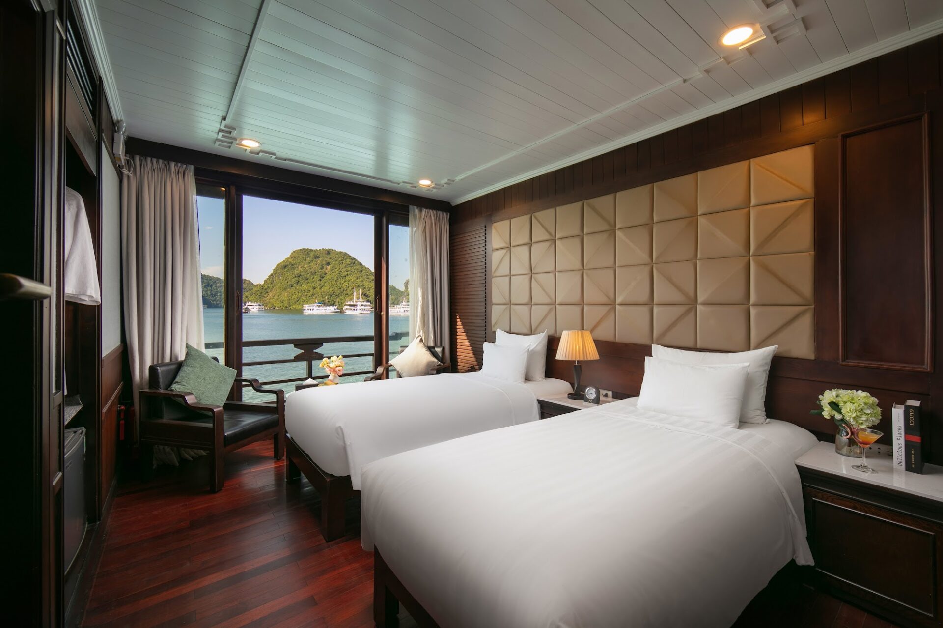 Cabin on Mila Cruise offers elegance, comfort, and breathtaking bay views. Featuring a king-size bed, stylish wooden flooring, and floor-to-ceiling glass doors, the room opens to a private balcony overlooking Ha Long Bay. Enjoy high-end amenities, including a flat-screen TV, minibar, writing desk, and ambient lighting. The en-suite bathroom features a rainfall shower and premium toiletries for a spa-like experience.