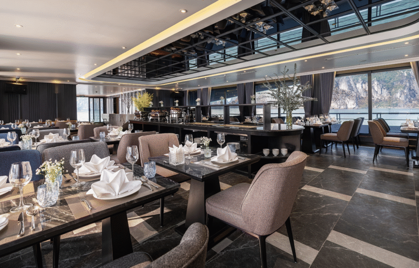 Dine in style at the cruise's elegant restaurant, which provides a blend of international and Vietnamese cuisines. With its modern decor and large windows, the restaurant ensures a memorable dining experience complemented by the stunning backdrop of Ha Long Bay.